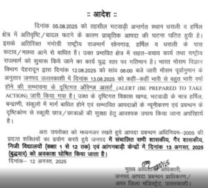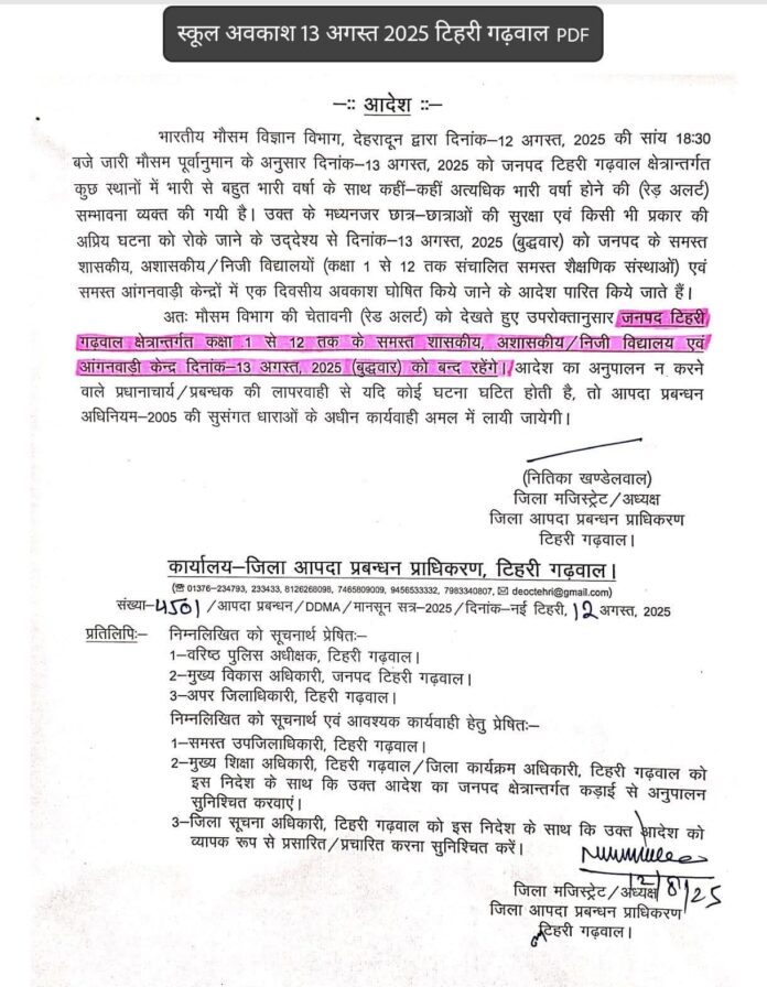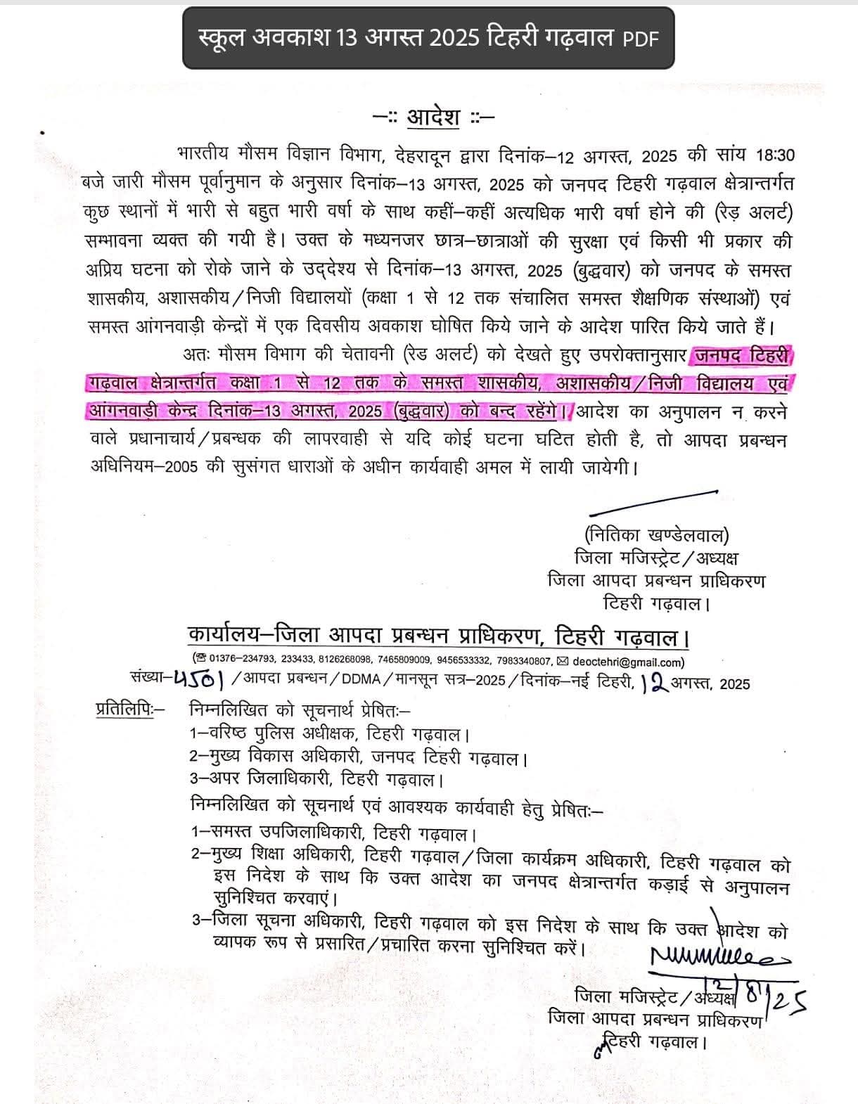 Homeहमारा उत्तराखण्डउत्तराखंड: इन 6 जिलों में कल सभी स्कूल रहेंगे बंद हमारा उत्तराखण्ड उत्तराखंड: इन 6 जिलों में कल सभी स्कूल रहेंगे बंद By LOKPAKSH August 12, 2025 0 599 Share FacebookTwitterPinterestWhatsApp Oplus_131072 TagsAll schools will remain closed tomorrow in this district Share FacebookTwitterPinterestWhatsApp Previous articleउत्तराखंड: आगामी 4 दिनों तक भारी बारिश को लेकर सभी डीएम को पत्र जारीNext articleमौसम विभाग की चेतावनी को देख इन 2 जिलों में 13 एवं 14 अगस्त को सभी स्कूल बंद LOKPAKSH RELATED ARTICLES हमारा उत्तराखण्ड पिछले तीन साल में 23 करोड़ से अधिक पर्यटक पहुंचे उत्तराखंड October 26, 2025 हमारा उत्तराखण्ड Rishikesh: खारा स्त्रोत में युवक की हत्या, आक्रोशित लोगों ने शव को सड़क पर रखकर बदरीनाथ हाईवे किया जाम October 26, 2025 हमारा उत्तराखण्ड उत्तराखंड आने वाले दूसरे राज्यों के वाहनों से वसूला जाएगा ग्रीन टैक्स, दिसंबर से होगी शुरुआत October 26, 2025 Leave a reply Cancel reply Comment: Please enter your comment! Name: Please enter your name here Email: You have entered an incorrect email address! Please enter your email address here Website: Save my name, email, and website in this browser for the next time I comment. Δ - Advertisment - Most Popular पिछले तीन साल में 23 करोड़ से अधिक पर्यटक पहुंचे उत्तराखंड October 26, 2025 Rishikesh: खारा स्त्रोत में युवक की हत्या, आक्रोशित लोगों ने शव को सड़क पर रखकर बदरीनाथ हाईवे किया जाम October 26, 2025 छेनागाड आपदा: मलबे में मिलीं पांच मजूदर की लाशें, नौ में से सात शव बरामद October 26, 2025 उत्तराखंड आने वाले दूसरे राज्यों के वाहनों से वसूला जाएगा ग्रीन टैक्स, दिसंबर से होगी शुरुआत October 26, 2025 Uttarakhand Weather: उत्तराखंड में चटख धूप से कम हुई ठंड, सप्ताह भर ऐसा रहेगा मौसम October 26, 2025 वन मंत्री उनियाल ने किया स्व. गौरा देवी की जनशताब्दी पर ‘गौरा देवी विशेष डाक टिकट’ का विमोचन October 25, 2025 Chhath Puja 2025: नहाय खाय के साथ आज से शुरू हुआ महापर्व छठ, दून में 23 से अधिक घाटों पर पूजा October 25, 2025 12 लाख की चरस के साथ हल्द्वानी क्षेत्र से एक नशा तस्कर गिरफ्तार October 25, 2025 नर्सिंग पाठ्यक्रम संचालन हेतु एम्पावर्ड समिति की बैठक, मेडिकल एवं नर्सिंग कॉलेजों को कोर्स संचालन एवं सीट वृद्धि की संस्तुति October 24, 2025 सीएम धामी ने किया बनबसा में आधुनिक लैंड पोर्ट परियोजना का स्थलीय निरीक्षण October 24, 2025 Load more