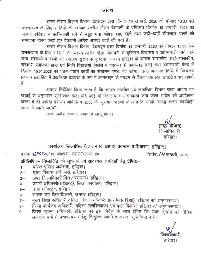 Homeहमारा उत्तराखण्डहरिद्वारशीतलहर को देख इस जिले में कल सभी स्कूल रहेंगे बंद हरिद्वार शीतलहर को देख इस जिले में कल सभी स्कूल रहेंगे बंद By LOKPAKSH January 14, 2026 0 712 Share FacebookTwitterPinterestWhatsApp Tagsall schools in this district to remain closed tomorrowcold wave Share FacebookTwitterPinterestWhatsApp Previous articleशीतलहर: इस जिले में 15 से 17 जनवरी तक सभी स्कूल रहेंगे बंदNext articleआदमखोर के चलते इस जिले के इन ब्लॉकों के स्कूलों में रहेगा 3 दिन का अवकाश LOKPAKSH RELATED ARTICLES हरिद्वार शीतलहर का ऑरेंज अलर्ट, इस जिले में कल सभी स्कूल रहेंगे बंद January 15, 2026 हरिद्वार Uttarakhand: लोहड़ी, मकर संक्रांति पर हरिद्वार आएं तो रूट प्लान का रखें ध्यान, भारी वाहनों का प्रवेश बंद January 13, 2026 हरिद्वार शीतलहर के चलते इस जिले में कल सभी स्कूल रहेंगे बंद December 29, 2025 Leave a reply Cancel reply Comment: Please enter your comment! Name: Please enter your name here Email: You have entered an incorrect email address! Please enter your email address here Website: Save my name, email, and website in this browser for the next time I comment. Δ Most Popular शीतलहर का ऑरेंज अलर्ट, इस जिले में कल सभी स्कूल रहेंगे बंद January 15, 2026 Uttarakhand Cabinet: यूसीसी में संशोधन और उत्तराखंड पर्यटन की नियमावली को मंजूरी, जानें धामी कैबिनेट के बड़े फैसले January 15, 2026 आदमखोर के चलते इस जिले के इन ब्लॉकों के स्कूलों में रहेगा 3 दिन का अवकाश January 14, 2026 शीतलहर: इस जिले में 15 से 17 जनवरी तक सभी स्कूल रहेंगे बंद January 14, 2026 उत्तरकाशी के ऐतिहासिक माघ मेले का सीएम धामी ने किया शुभारंभ January 14, 2026 Uttarakhand Weather: प्रदेश में दो दिन बाद बिगड़ेगा मौसम, बारिश और बर्फबारी की चेतावनी January 14, 2026 मुख्यमंत्री ने खटीमा में किया 33 करोड़ की विकास योजनाओं का लोकार्पण व शिलान्यास January 14, 2026 Uttarakhand Board Exam: 21 फरवरी से 20 मार्च तक होंगी 10वीं-12वीं की परीक्षाएं, यहां देखिए पूरी डेटशीट January 13, 2026 UBSE 12th Date Sheet 2026: उत्तराखंड बोर्ड 12वीं की डेटशीट जारी, 21 फरवरी से होगी परीक्षा, यहां देखें January 13, 2026 Uttarakhand: लोहड़ी, मकर संक्रांति पर हरिद्वार आएं तो रूट प्लान का रखें ध्यान, भारी वाहनों का प्रवेश बंद January 13, 2026 Load more