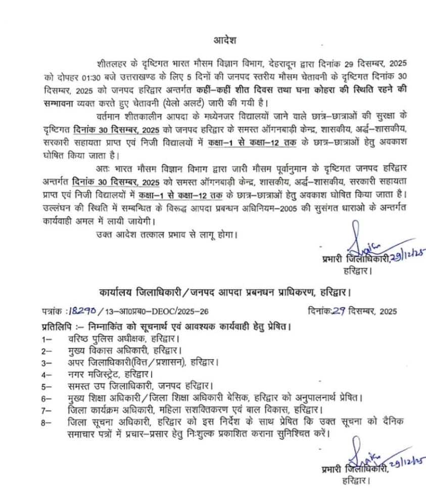 वर्तमान शीतकालीन आपदा के मध्येनजर विद्यालयों जाने वाले छात्र-छात्राओं की सुरक्षा के दृष्टिगत दिनांक 30 दिसम्बर, 2025 को जनपद हरिद्वार के समस्त ऑगनबाड़ी केन्द्र, शासकीय, अर्द्ध-शासकीय, सरकारी सहायता प्राप्त एवं निजी विद्यालयों में कक्षा 1 से कक्षा-12 तक के छात्र-छात्राओं हेतु अवकाश घोषित किया जाता है।