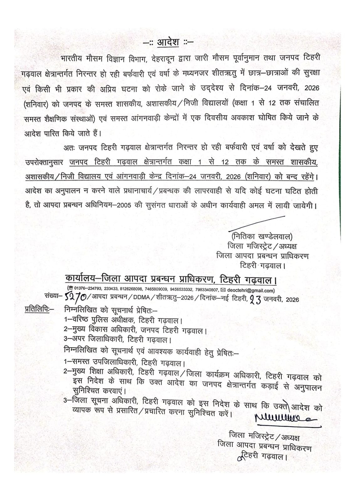 Homeहमारा उत्तराखण्डटिहरीमौसम को देखते हुए कल इन 5 जिलों के सभी स्कूलों में... टिहरी मौसम को देखते हुए कल इन 5 जिलों के सभी स्कूलों में रहेगा अवकाश By LOKPAKSH January 23, 2026 0 862 Share FacebookTwitterPinterestWhatsApp Tagsall schools in the district will remain closed tomorrowdue to the weather Share FacebookTwitterPinterestWhatsApp Previous articleअब इस जिले में भी रहेंगे कल सभी स्कूल बंद, आदेश जारी LOKPAKSH RELATED ARTICLES टिहरी राज्य कर्मचारी संयुक्त परिषद टिहरी ने विभिन्न मांगों को की गेट मीटिंग January 22, 2026 टिहरी थौलधार खेलकूद एवं सांस्कृतिक महोत्सव में बोले सीएम धामी-लोक संस्कृति के संरक्षण से मजबूत होगी देवभूमि की पहचान January 10, 2026 टिहरी टिहरी: सीएम धामी ने किया इंटरनेशनल प्रेसीडेंट कप एवं टिहरी वाटर स्पोर्ट्स कप का समापन November 30, 2025 Leave a reply Cancel reply Comment: Please enter your comment! Name: Please enter your name here Email: You have entered an incorrect email address! Please enter your email address here Website: Save my name, email, and website in this browser for the next time I comment. Δ - Advertisment - Most Popular अब इस जिले में भी रहेंगे कल सभी स्कूल बंद, आदेश जारी January 23, 2026 Uttarakhand: दिनपट्टा हुआ तय…मां नंदा ने जताई कैलाश जाने की इच्छा, इसी साल होगी बड़ी जात January 23, 2026 मरकर भी अमर हो गया ऋषिकेश का रघु, अंगदान कर 5 लोगों को दिया नया जीवन January 23, 2026 Mussoorie Snowfall: ट्रेंडिंग में आज पहाड़ों की रानी, बर्फ की पहली चादर के साथ लौटा जादू, रील्स-वीडियो वायरल January 23, 2026 इस दिन खुलेंगे भू बैकुंठ धाम श्री बदरीनाथ जी के कपाट January 23, 2026 राज्य कर्मचारी संयुक्त परिषद टिहरी ने विभिन्न मांगों को की गेट मीटिंग January 22, 2026 दायित्वधारियों की 5वीं सूची जल्द हो सकती है जारी, नए मंत्रियों की एंट्री को उत्साह का माहौल January 22, 2026 Uttarakhand Weather: कल बारिश-बर्फबारी के आसार, एजेंसियों को अलर्ट मोड पर रखने के निर्देश January 22, 2026 उत्तराखंड: एक अप्रैल से नई बिजली दरें लागू करने का प्रस्ताव, 18 फरवरी से चार शहरों में जनसुनवाई January 22, 2026 गृह मंत्री शाह ने गीता प्रेस द्वारा प्रकाशित मासिक पत्र ‘कल्याण’ के शताब्दी अंक का किया विमोचन January 21, 2026 Load more