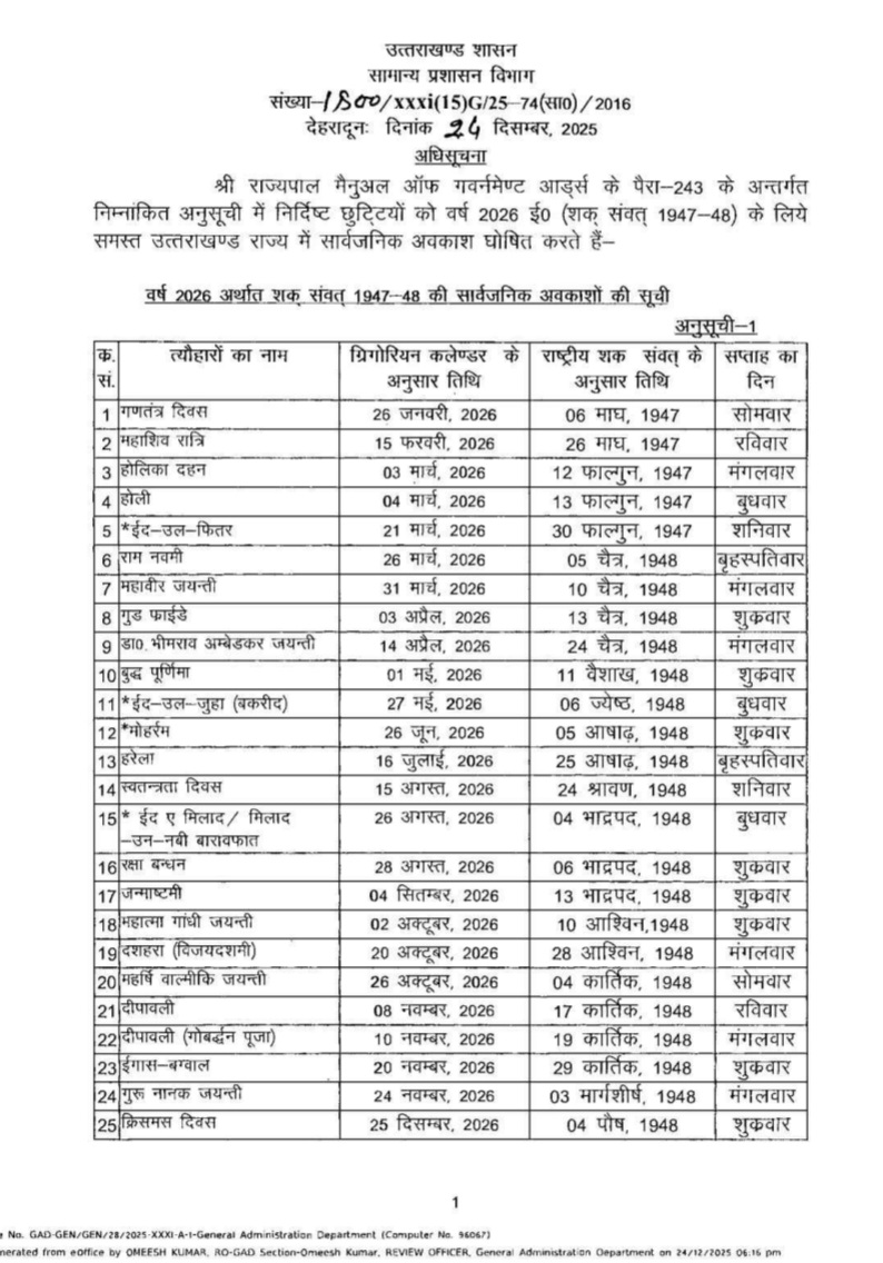 Homeहमारा उत्तराखण्डउत्तराखंड: वर्ष 2026 के लिए सरकारी छुट्टियों की लिस्ट जारी, देखें लिस्ट हमारा उत्तराखण्ड उत्तराखंड: वर्ष 2026 के लिए सरकारी छुट्टियों की लिस्ट जारी, देखें लिस्ट By LOKPAKSH December 24, 2025 0 385 Share FacebookTwitterPinterestWhatsApp TagsList of government holidays for the year 2026 releasedsee listuttarakhand Share FacebookTwitterPinterestWhatsApp Previous articleकेदारकांठा पर्यटन-तीर्थाटन शीतकालीन महोत्सव में पहुंचे सीएम धामीNext articleउत्तराखंड शिक्षक संघ चुनाव: नतीजे जारी, जयदीप रावत गढ़वाल मंडल अध्यक्ष और मनमोहन चौहान मंडलीय मंत्री निर्वाचित LOKPAKSH RELATED ARTICLES हमारा उत्तराखण्ड उत्तराखंड शिक्षक संघ चुनाव: नतीजे जारी, जयदीप रावत गढ़वाल मंडल अध्यक्ष और मनमोहन चौहान मंडलीय मंत्री निर्वाचित December 24, 2025 हमारा उत्तराखण्ड Uttarakhand: गुरु गोविंद सिंह जयंती पर सार्वजनिक अवकाश घोषित, सभी स्कूल और दफ्तर रहेंगे बंद December 24, 2025 हमारा उत्तराखण्ड Uttarakhand Cabinet: कैशलैस इलाज के लिए बढ़ेगा अशंदान, कैबिनेट में आए 11 प्रस्ताव, ये हुए फैसले December 24, 2025 Leave a reply Cancel reply Comment: Please enter your comment! Name: Please enter your name here Email: You have entered an incorrect email address! Please enter your email address here Website: Save my name, email, and website in this browser for the next time I comment. Δ Most Popular उत्तराखंड शिक्षक संघ चुनाव: नतीजे जारी, जयदीप रावत गढ़वाल मंडल अध्यक्ष और मनमोहन चौहान मंडलीय मंत्री निर्वाचित December 24, 2025 केदारकांठा पर्यटन-तीर्थाटन शीतकालीन महोत्सव में पहुंचे सीएम धामी December 24, 2025 ‘कैम्पा कोला’ की डिस्ट्रीब्यूटरशिप दिलाने के नाम पर साईबर धोखाधड़ी करने वाले गिरोह के दो शातिर गिरफ्तार December 24, 2025 Uttarakhand: गुरु गोविंद सिंह जयंती पर सार्वजनिक अवकाश घोषित, सभी स्कूल और दफ्तर रहेंगे बंद December 24, 2025 Uttarakhand Cabinet: कैशलैस इलाज के लिए बढ़ेगा अशंदान, कैबिनेट में आए 11 प्रस्ताव, ये हुए फैसले December 24, 2025 लिफ्ट में फंसे 12 लोग, मची अफरा-तफरी, 20 मिनट तक नहीं आई बिजली December 24, 2025 Ankita Murder Case: एक वीडियो ने दून से दिल्ली तक मचाई हलचल, VIP को लेकर फिर घमासान December 24, 2025 Uttarakhand Weather: दून समेत छह जिलों में कोहरे का यलो अलर्ट, शीत दिवस जैसी स्थिति रहने के आसार December 24, 2025 मानव–वन्यजीव संघर्ष: सामाजिक-पर्यावरणीय संकट की चेतावनी देती प्रकृति December 23, 2025 रील पर विवाद…पूर्व सीएम हरीश रावत ने भाजपा पर लगाए आरोप, एफआईआर दर्ज कराने पहुंचे थाने December 23, 2025 Load more
