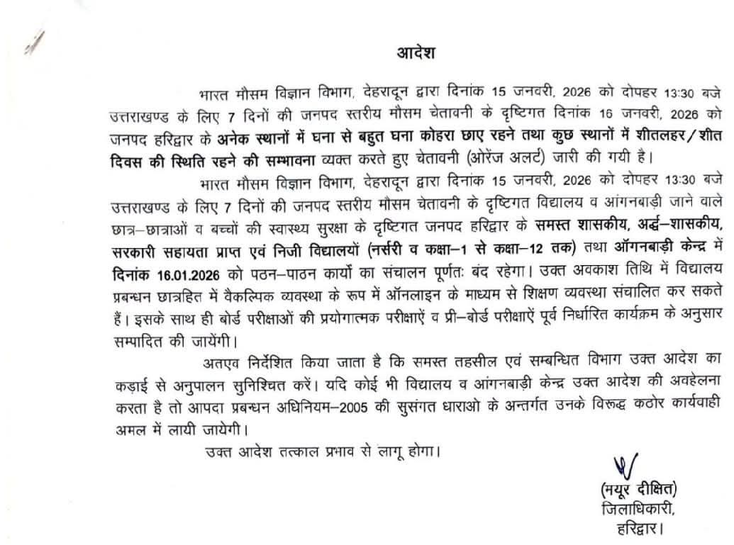 Homeहमारा उत्तराखण्डहरिद्वारशीतलहर का ऑरेंज अलर्ट, इस जिले में कल सभी स्कूल रहेंगे बंद हरिद्वार शीतलहर का ऑरेंज अलर्ट, इस जिले में कल सभी स्कूल रहेंगे बंद By LOKPAKSH January 15, 2026 0 238 Share FacebookTwitterPinterestWhatsApp उत्तराखंड में इन दिनों ठंड का प्रकोप बढ़ गया है। शीतलहर के ऑरेंज अलर्ट के पूर्वानुमान के चलते जिलाधिकारी, हरिद्वार द्वारा जनपद में कल 16 जनवरी 2026 को आंगनबाड़ी और स्कूलों (नर्सरी और कक्षा 1 से 12 तक) में अवकाश घोषित। Tagsall schools in this district to remain closed tomorrowOrange alert for cold wave Share FacebookTwitterPinterestWhatsApp Previous articleUttarakhand Cabinet: यूसीसी में संशोधन और उत्तराखंड पर्यटन की नियमावली को मंजूरी, जानें धामी कैबिनेट के बड़े फैसले LOKPAKSH RELATED ARTICLES हरिद्वार शीतलहर को देख इस जिले में कल सभी स्कूल रहेंगे बंद January 14, 2026 हरिद्वार Uttarakhand: लोहड़ी, मकर संक्रांति पर हरिद्वार आएं तो रूट प्लान का रखें ध्यान, भारी वाहनों का प्रवेश बंद January 13, 2026 हरिद्वार शीतलहर के चलते इस जिले में कल सभी स्कूल रहेंगे बंद December 29, 2025 Leave a reply Cancel reply Comment: Please enter your comment! Name: Please enter your name here Email: You have entered an incorrect email address! Please enter your email address here Website: Save my name, email, and website in this browser for the next time I comment. Δ Most Popular Uttarakhand Cabinet: यूसीसी में संशोधन और उत्तराखंड पर्यटन की नियमावली को मंजूरी, जानें धामी कैबिनेट के बड़े फैसले January 15, 2026 आदमखोर के चलते इस जिले के इन ब्लॉकों के स्कूलों में रहेगा 3 दिन का अवकाश January 14, 2026 शीतलहर को देख इस जिले में कल सभी स्कूल रहेंगे बंद January 14, 2026 शीतलहर: इस जिले में 15 से 17 जनवरी तक सभी स्कूल रहेंगे बंद January 14, 2026 उत्तरकाशी के ऐतिहासिक माघ मेले का सीएम धामी ने किया शुभारंभ January 14, 2026 Uttarakhand Weather: प्रदेश में दो दिन बाद बिगड़ेगा मौसम, बारिश और बर्फबारी की चेतावनी January 14, 2026 मुख्यमंत्री ने खटीमा में किया 33 करोड़ की विकास योजनाओं का लोकार्पण व शिलान्यास January 14, 2026 Uttarakhand Board Exam: 21 फरवरी से 20 मार्च तक होंगी 10वीं-12वीं की परीक्षाएं, यहां देखिए पूरी डेटशीट January 13, 2026 UBSE 12th Date Sheet 2026: उत्तराखंड बोर्ड 12वीं की डेटशीट जारी, 21 फरवरी से होगी परीक्षा, यहां देखें January 13, 2026 Uttarakhand: लोहड़ी, मकर संक्रांति पर हरिद्वार आएं तो रूट प्लान का रखें ध्यान, भारी वाहनों का प्रवेश बंद January 13, 2026 Load more