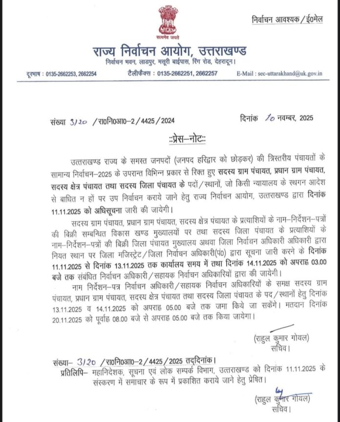 उत्तराखंड में हरिद्वार जिले को छोड़कर त्रिस्तरीय पंचायतों में सभी खाली पदों पर 20 नवंबर को उप चुनाव होंगे। उप चुनाव के लिए मंगलवार को अधिसूचना जारी की जाएगी। राज्य में ग्राम पंचायतों के 33114 पद खाली हैं। इन पदों पर उप चुनाव के बाद 4843 ग्राम पंचायतों का गठन होगा।