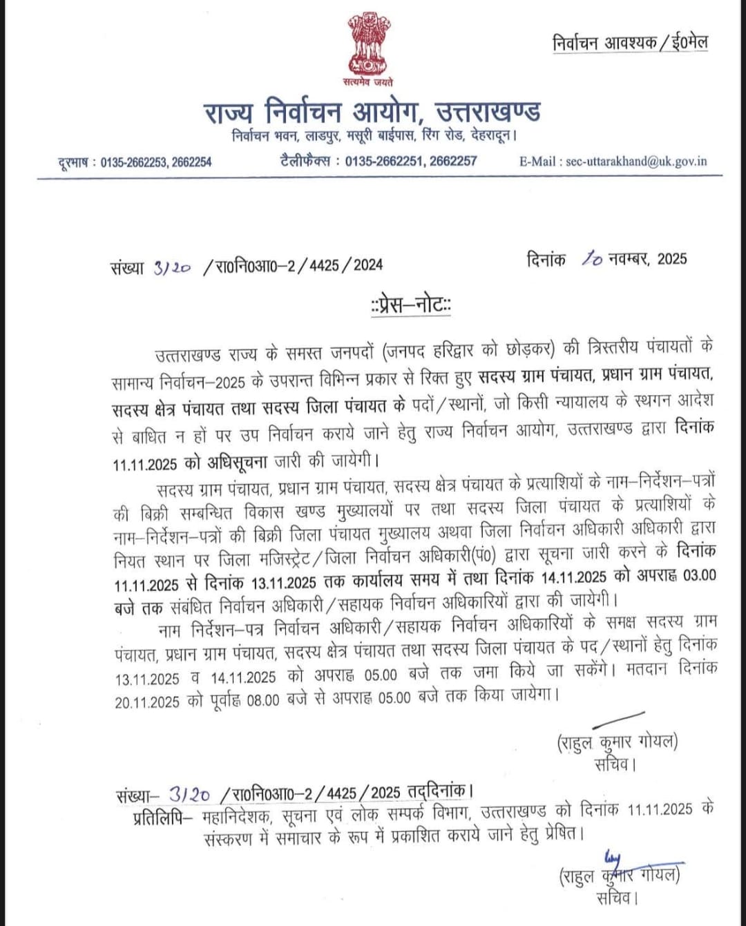 राज्य निर्वाचन आयुक्त सुशील कुमार के मुताबिक 13 और 14 नवंबर को नामांकन पत्र जमा होंगे। ग्राम पंचायत सदस्य, ग्राम प्रधान और क्षेत्र पंचायत सदस्य के नामांकन पत्र ब्लॉक मुख्यालय और जिला पंचायत सदस्य के नामांकन पत्र जिला मुख्यालय में जमा किया जाएगा। उन्होंने बताया कि त्रिस्तरीय पंचायतों में खाली पदों पर मतदान 20 नवंबर को सुबह आठ बजे से शाम पांच बजे तक होगा।