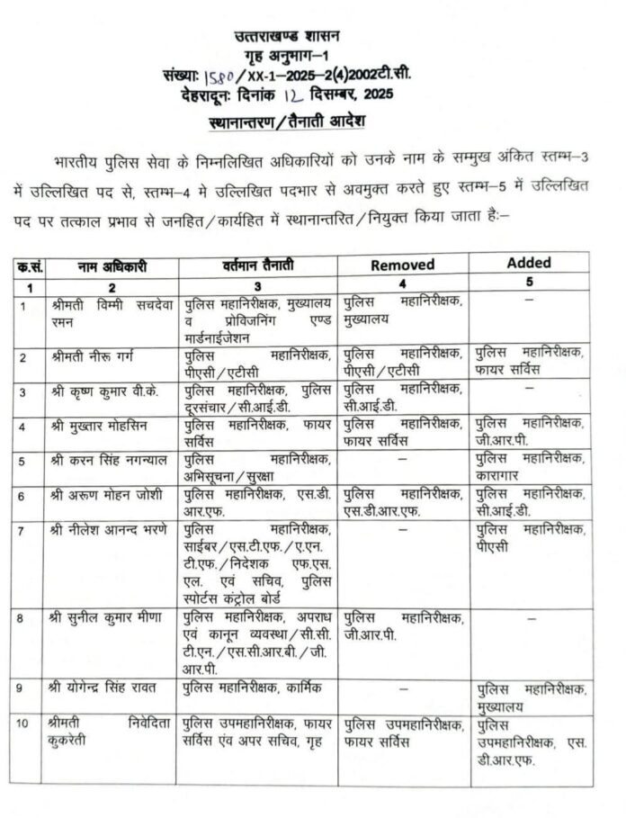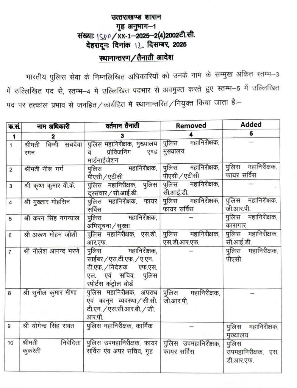डीआईजी निवेदिता कुकरेती से फायर सर्विस हटाकर एसडीआरएफ की जिम्मेदारी सौंपी गई है। आईपीएस यशवंत सिंह को सेनानायक आईआरबी प्रथम रामनगर, आईपीएस रामचंद्र राजगुुरु को एसपी पुलिस मुख्यालय, आईपीएस सरिता डोबाल को एसपी एटीएस, आईपीएस हरीश वर्मा को सेनानायक, 40वीं वाहिनी पीएसी, हरिद्वार की जिम्मेदारी सौंपी गई है।