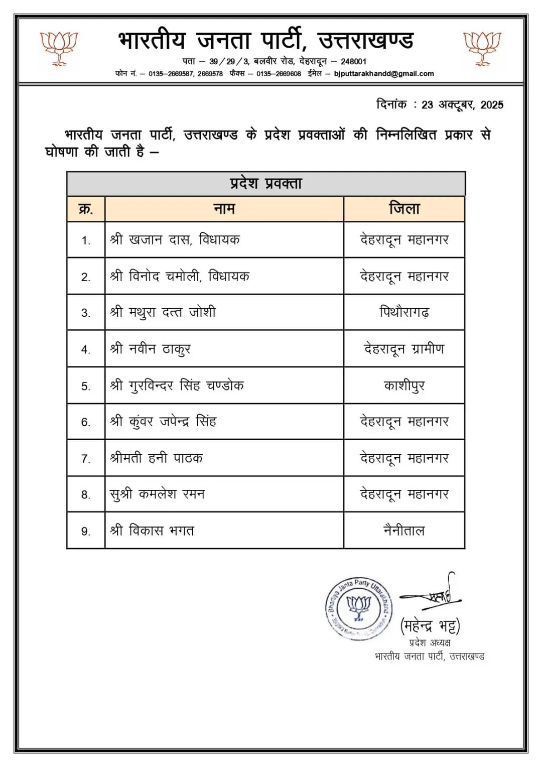Uttarakhand: भाजपा में नौ प्रवक्ता नियुक्त, विधायक खजानदास, विनोद चमोली, हनी पाठक सहित इन्हें मिली जिम्मेदारी