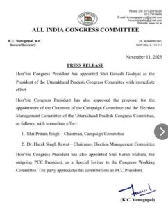 Uttarakhand: गणेश गोदियाल को फिर उत्तराखंड कांग्रेस की कमान, हरक सिंह और प्रीतम को भी मिली बड़ी जिम्मेदारी