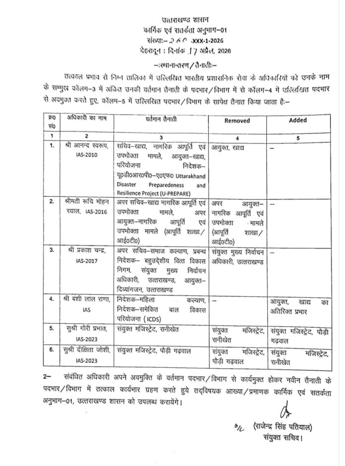 Homeहमारा उत्तराखण्डउत्तराखंड में बड़ा प्रशासनिक फेरबदल: सचिवालय सेवा के 26 PCS अधिकारियों के... हमारा उत्तराखण्ड उत्तराखंड में बड़ा प्रशासनिक फेरबदल: सचिवालय सेवा के 26 PCS अधिकारियों के तबादले, 6 IAS का कार्यभार बदला By LOKPAKSH April 17, 2026 0 441 Share FacebookXPinterestWhatsApp उत्तराखंड की धामी सरकार ने गुरुवार को अफसरशाही में बड़ा बदलाव किया है। सचिवालय सेवा के 26 पीसीएस अधिकारियों के तबादले किए गए तो वहीं 6 आईएएस का कार्यभार बदला गया है। Tags26 PCS officers of the secretariat service transferred6 IAS officers reassignedMajor administrative reshuffleuttarakhand Share FacebookXPinterestWhatsApp Previous articleजन शिकायत पड़ताल करने मौके पर पहुंचे सीएम, वीडियो कॉल के जरिए अधिकारियों को दिखाई हकीकत LOKPAKSH RELATED ARTICLES हमारा उत्तराखण्ड जन शिकायत पड़ताल करने मौके पर पहुंचे सीएम, वीडियो कॉल के जरिए अधिकारियों को दिखाई हकीकत April 17, 2026 हमारा उत्तराखण्ड लोक भवन: राज्यपाल व मुख्यमंत्री ने किया बहुउद्देशीय भवनों का शिलान्यास, एक ही परिसर में मिलेंगी समेकित सुविधाएं April 16, 2026 हमारा उत्तराखण्ड उत्तराखंड: महिला स्वास्थ्य कार्यकर्ता के 335 पदों पर भर्ती प्रक्रिया शुरू, बोर्ड ने संशोधित विज्ञप्ति की जारी April 16, 2026 Leave a reply Cancel reply Comment: Please enter your comment! Name: Please enter your name here Email: You have entered an incorrect email address! Please enter your email address here Website: Save my name, email, and website in this browser for the next time I comment. Δ Most Popular जन शिकायत पड़ताल करने मौके पर पहुंचे सीएम, वीडियो कॉल के जरिए अधिकारियों को दिखाई हकीकत April 17, 2026 लोक भवन: राज्यपाल व मुख्यमंत्री ने किया बहुउद्देशीय भवनों का शिलान्यास, एक ही परिसर में मिलेंगी समेकित सुविधाएं April 16, 2026 उत्तराखंड: महिला स्वास्थ्य कार्यकर्ता के 335 पदों पर भर्ती प्रक्रिया शुरू, बोर्ड ने संशोधित विज्ञप्ति की जारी April 16, 2026 CBSE Board 10th Result: रुड़की की निशिता ने हासिल किए 99.4% अंक, चकराता की स्वर्णिका ने 99.2% लाकर मारी बाजी April 15, 2026 ओएनजीसी के रिटायर्ड बुजुर्ग से 1.87 करोड़ रुपये की ठगी, जालसाजों ने निवेश के नाम पर फंसाया April 15, 2026 सीबीआई कोर्ट का फैसला, करोड़ों के केसीसी घोटाले में यूजीबी के पूर्व मैनेजर सहित 10 को सजा April 15, 2026 उत्तराखंड: वन विभाग में 41 डिप्टी रेंजर्स बने प्रभारी वन क्षेत्राधिकारी April 15, 2026 CBSE 10th Result 2026 OUT: सीबीएसई दसवीं के नतीजे जारी, 93.70 फीसदी बच्चे हुए पास, लड़कियां फिर आगे April 15, 2026 अब राज्य के हर स्कूल में बजेगी वॉटर बेल April 15, 2026 दून-दिल्ली एक्सप्रेसवे: वॉल्वो और एसी बसों का समय तय, किराये में बदलाव की तैयारी, यहां देखें पूरा शेड्यल April 15, 2026 Load more