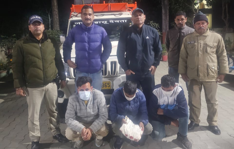 उत्तराखण्ड एसटीएफ की एण्टी नारकोटिक्स टास्क फोर्स द्वारा थाना विकासनगर देहरादून पुलिस के साथ संयुक्त अभियान में दिनांक 06.11.2025 की सुबह को थाना विकासनगर देहरादून क्षेत्र से 3 अभियुक्तों 1-दिनेश पुत्र भोपालू नि0 ग्राम जिसऊ घराना तहसील कालसी जनपद देहरादून उम्र 26 वर्ष, 2- कुन्दन चौहान पुत्र अमर सिंह नि0 ग्राम सूर्यो तहसील कालसी जनपद देहरादून, 3- पंकज पुत्र सरदार सिंह नि0 ग्राम सूर्यो तहसील कालसी जनपद देहरादून उम्र 25 वर्ष को 1.505 किग्रा0 चरस परिवहन करते हुए मय वाहन के गिरफ्तार किया गया ।
