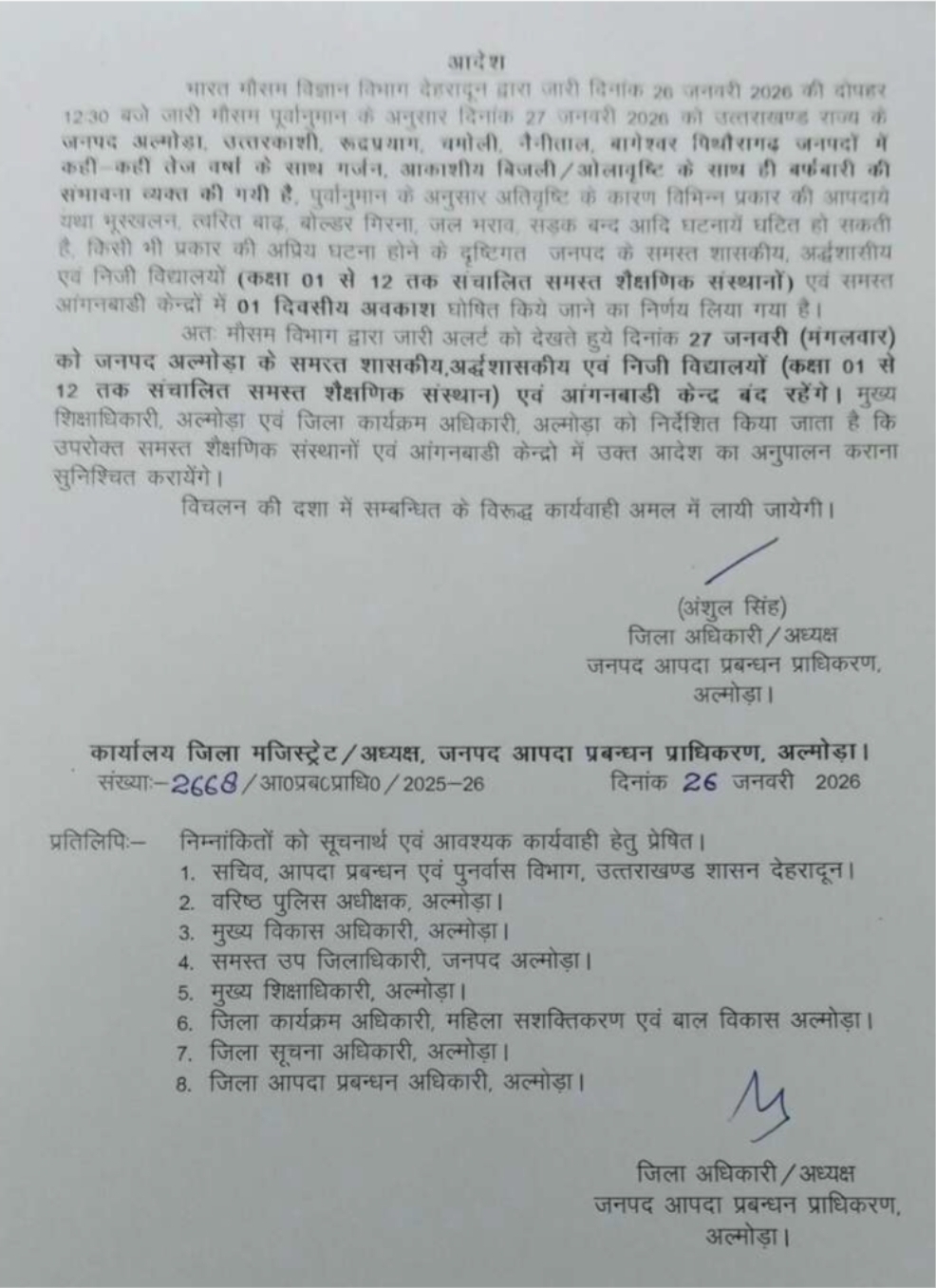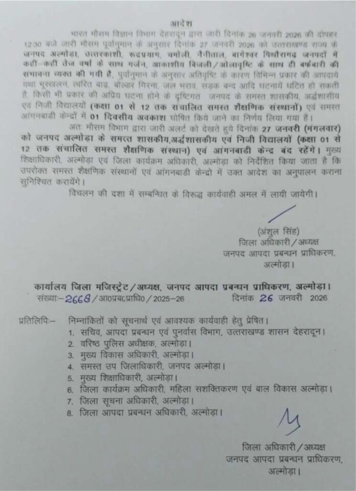 Homeहमारा उत्तराखण्डअल्मोड़ामौसम के चलते कल इन दो जिलों में सभी स्कूल रहेंगे बंद अल्मोड़ा मौसम के चलते कल इन दो जिलों में सभी स्कूल रहेंगे बंद By LOKPAKSH January 26, 2026 0 347 Share FacebookTwitterPinterestWhatsApp Tagsall schools in this district will remain closed tomorrowWeather department warns Share FacebookTwitterPinterestWhatsApp Previous articleमौसम चेतावनी: उत्तराखंड में 27 और 28 जनवरी भारी वर्षा और बर्फबारी का अलर्ट जारीNext articleUniform Civil Code: उत्तराखंड में समान नागरिक संहिता का संशोधित अध्यादेश लागू, जानिए क्या हुए नए प्रावधान LOKPAKSH RELATED ARTICLES अल्मोड़ा Almora Bus Accident: अल्मोड़ा में बड़ा हादसा, खाई में गिरी बस, सात यात्रियों की मौत, दो महिला समेत 12 घायल December 30, 2025 अल्मोड़ा सीएम धामी की अल्मोड़ा में मॉर्निंग वॉक, स्थानीय लोगों से चाय पर की चर्चा December 23, 2025 अल्मोड़ा सीएम धामी ने अल्मोड़ा में किया सांसद खेल महोत्सव शुभारंभ, की यह घोषणाएं December 22, 2025 Leave a reply Cancel reply Comment: Please enter your comment! Name: Please enter your name here Email: You have entered an incorrect email address! Please enter your email address here Website: Save my name, email, and website in this browser for the next time I comment. Δ - Advertisment - Most Popular Uniform Civil Code: उत्तराखंड में समान नागरिक संहिता का संशोधित अध्यादेश लागू, जानिए क्या हुए नए प्रावधान January 26, 2026 मौसम चेतावनी: उत्तराखंड में 27 और 28 जनवरी भारी वर्षा और बर्फबारी का अलर्ट जारी January 26, 2026 दिग्गज कांग्रेस नेता पूर्व विधायक नेगी का लंबी बीमारी के बाद निधन January 26, 2026 गणतंत्र दिवस: राज्य समारोह में सूचना विभाग की झांकी ने तीसरी बार प्राप्त किया प्रथम स्थान January 26, 2026 गणतंत्र दिवस के अवसर पर राज्यपाल ने लोक भवन एवं परेड ग्राउंड में फहराया राष्ट्रीय ध्वज January 26, 2026 Republic Day 2026: मुख्यमंत्री धामी ने आवासीय परिसर में फहराया ध्वज, प्रदेशवासियों को दी शुभकामनाएं January 26, 2026 पद्म पुस्कारों का एलान: धर्मेंद्र को पद्म विभूषण, शिबू सोरेन को पद्म भूषण, रोहित को पद्म श्री, देखें सूची January 25, 2026 लखनऊ: उत्तरायणी कौथिक में शामिल हुए मंत्री सुबोध उनियाल, प्रवासी उत्तराखंडियों के योगदान की सराहना January 25, 2026 वर्दी घोटाला: CM धामी ने दिए DIG के निलंबन के आदेश January 24, 2026 Uttarakhand Weather: बारिश-बर्फबारी से लौटी ठंड, छह डिग्री गिरा पारा, कई जिलों में स्कूल बंद January 24, 2026 Load more