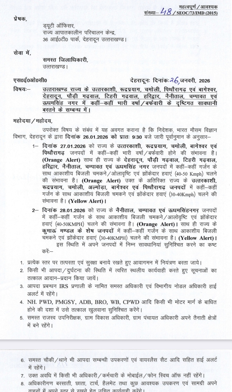 Homeहमारा उत्तराखण्डमौसम चेतावनी: उत्तराखंड में 27 और 28 जनवरी भारी वर्षा और बर्फबारी... हमारा उत्तराखण्ड मौसम चेतावनी: उत्तराखंड में 27 और 28 जनवरी भारी वर्षा और बर्फबारी का अलर्ट जारी By LOKPAKSH January 26, 2026 0 424 Share FacebookTwitterPinterestWhatsApp Tagsissued for heavy rain and snowfallon January 27 and 28uttarakhandWeather warning Share FacebookTwitterPinterestWhatsApp Previous articleदिग्गज कांग्रेस नेता पूर्व विधायक नेगी का लंबी बीमारी के बाद निधन LOKPAKSH RELATED ARTICLES हमारा उत्तराखण्ड दिग्गज कांग्रेस नेता पूर्व विधायक नेगी का लंबी बीमारी के बाद निधन January 26, 2026 हमारा उत्तराखण्ड गणतंत्र दिवस: राज्य समारोह में सूचना विभाग की झांकी ने तीसरी बार प्राप्त किया प्रथम स्थान January 26, 2026 हमारा उत्तराखण्ड गणतंत्र दिवस के अवसर पर राज्यपाल ने लोक भवन एवं परेड ग्राउंड में फहराया राष्ट्रीय ध्वज January 26, 2026 Leave a reply Cancel reply Comment: Please enter your comment! Name: Please enter your name here Email: You have entered an incorrect email address! Please enter your email address here Website: Save my name, email, and website in this browser for the next time I comment. Δ - Advertisment - Most Popular दिग्गज कांग्रेस नेता पूर्व विधायक नेगी का लंबी बीमारी के बाद निधन January 26, 2026 गणतंत्र दिवस: राज्य समारोह में सूचना विभाग की झांकी ने तीसरी बार प्राप्त किया प्रथम स्थान January 26, 2026 गणतंत्र दिवस के अवसर पर राज्यपाल ने लोक भवन एवं परेड ग्राउंड में फहराया राष्ट्रीय ध्वज January 26, 2026 Republic Day 2026: मुख्यमंत्री धामी ने आवासीय परिसर में फहराया ध्वज, प्रदेशवासियों को दी शुभकामनाएं January 26, 2026 पद्म पुस्कारों का एलान: धर्मेंद्र को पद्म विभूषण, शिबू सोरेन को पद्म भूषण, रोहित को पद्म श्री, देखें सूची January 25, 2026 लखनऊ: उत्तरायणी कौथिक में शामिल हुए मंत्री सुबोध उनियाल, प्रवासी उत्तराखंडियों के योगदान की सराहना January 25, 2026 वर्दी घोटाला: CM धामी ने दिए DIG के निलंबन के आदेश January 24, 2026 Uttarakhand Weather: बारिश-बर्फबारी से लौटी ठंड, छह डिग्री गिरा पारा, कई जिलों में स्कूल बंद January 24, 2026 मौसम को देखते हुए कल इन 9 जिलों के सभी स्कूलों में रहेगा अवकाश January 23, 2026 अब इस जिले में भी रहेंगे कल सभी स्कूल बंद, आदेश जारी January 23, 2026 Load more